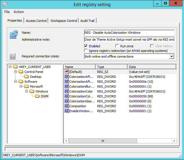 With RES One Workspace it is impossible to set the color behavior properly by using the “User Registry” settings. When applying the correct keys to RES User Registry Settings only, the color of the taskbar and titlebar is changing every session (white, gray, black, etc.) I’ve figured out that the workspace composer isn’t messing these registry keys, but the enabled Active Setup is.