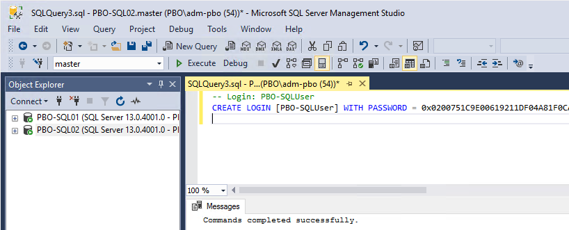 6. The result of the query is a message with SQL queries to create the SQL Login on other SQL servers with the same SID, username and password. So copy all queries for SQL-users you want to copy to the other SQL AlwaysOn Replica servers: