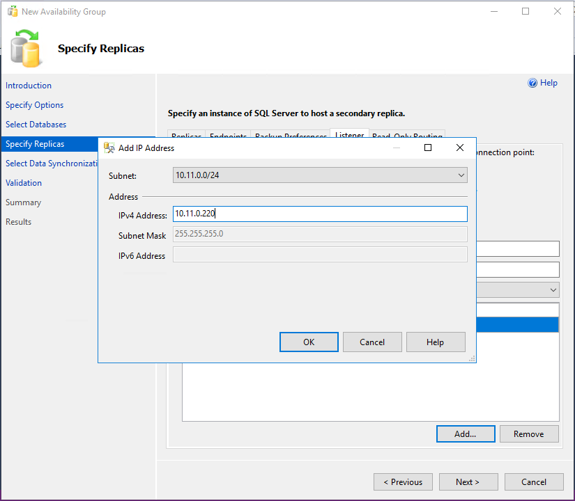16. Enter the IP-address for the listener. If multi subnet failover cluster is configured, enter IP-address for all the possible failover subnets (in this example 2 subnets):
