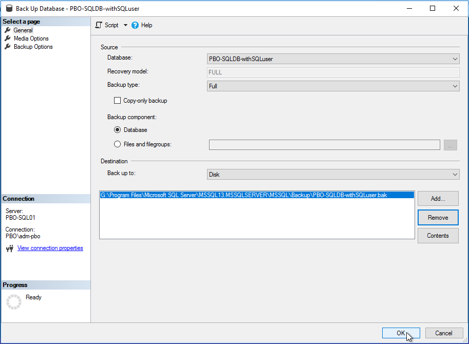 4. Go to Options and verify if the Recovery model is set to Full. If not, change it to Full. Click OK: