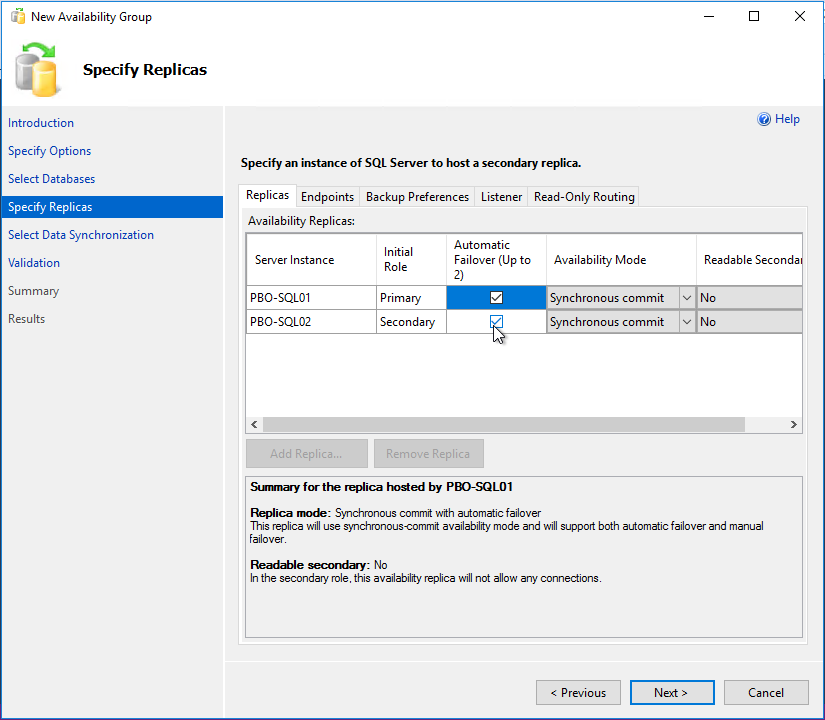 14. Select Automatic Failover and ensure Availability mode: Synchronous commit. Click Listener tab: