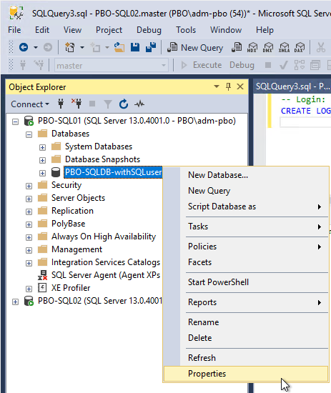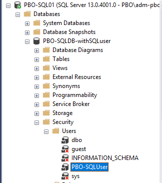 The SQL Server PBO-SQL01 does have a SQL user PBO-SQLUser because the database and user is initially created on PBO-SQL01. When the “Basic” AlwaysOn Availability Group is created, the SQL users of that database are not synchronized to the other Availability Replica Server PBO-SQL02. Active Directoy users and groups will be synced to the other Availability replica servers.