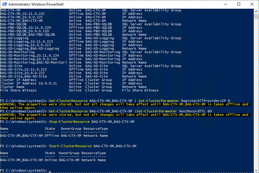 Import-Module FailoverClusters Get-ClusterResource BAG-CTX-XM_BAG-CTX-XM | Set-ClusterParameter RegisterAllProvidersIP 0 Get-ClusterResource BAG-CTX-XM_BAG-CTX-XM |Set-ClusterParameter HostRecordTTL 60 Stop-ClusterResource BAG-CTX-XM_BAG-CTX-XM Start-ClusterResource BAG-CTX-XM_BAG-CTX-XM |